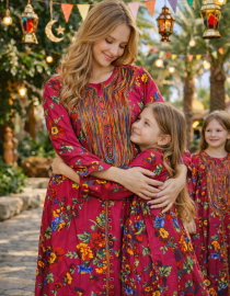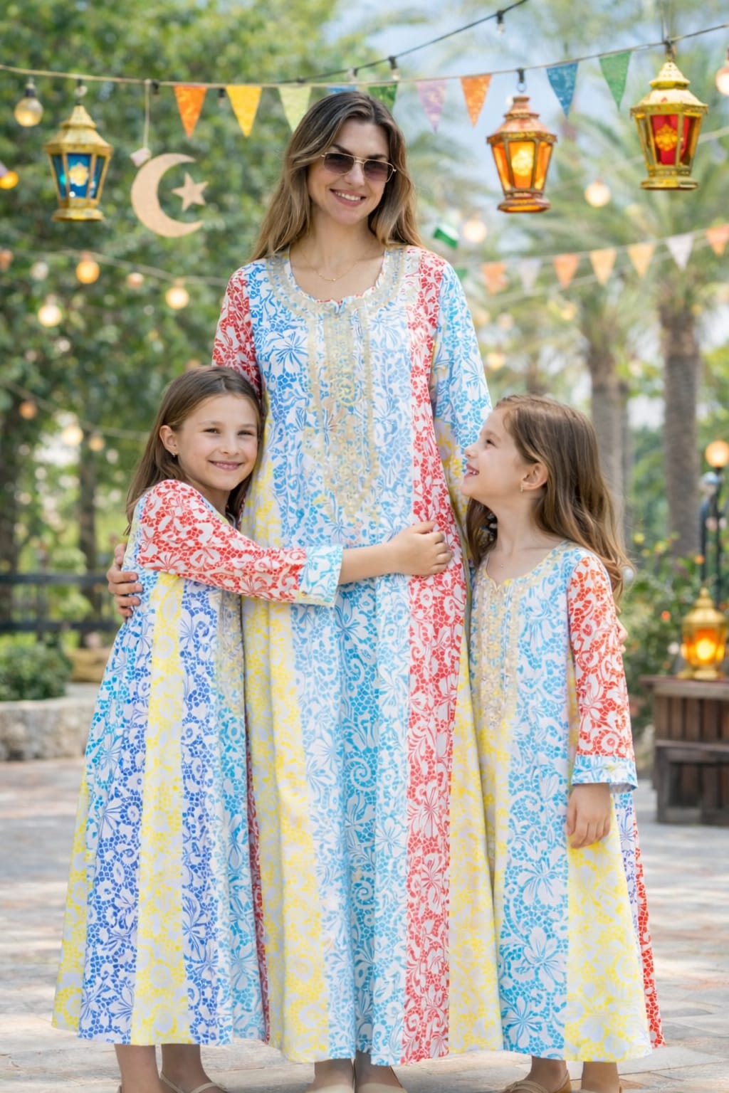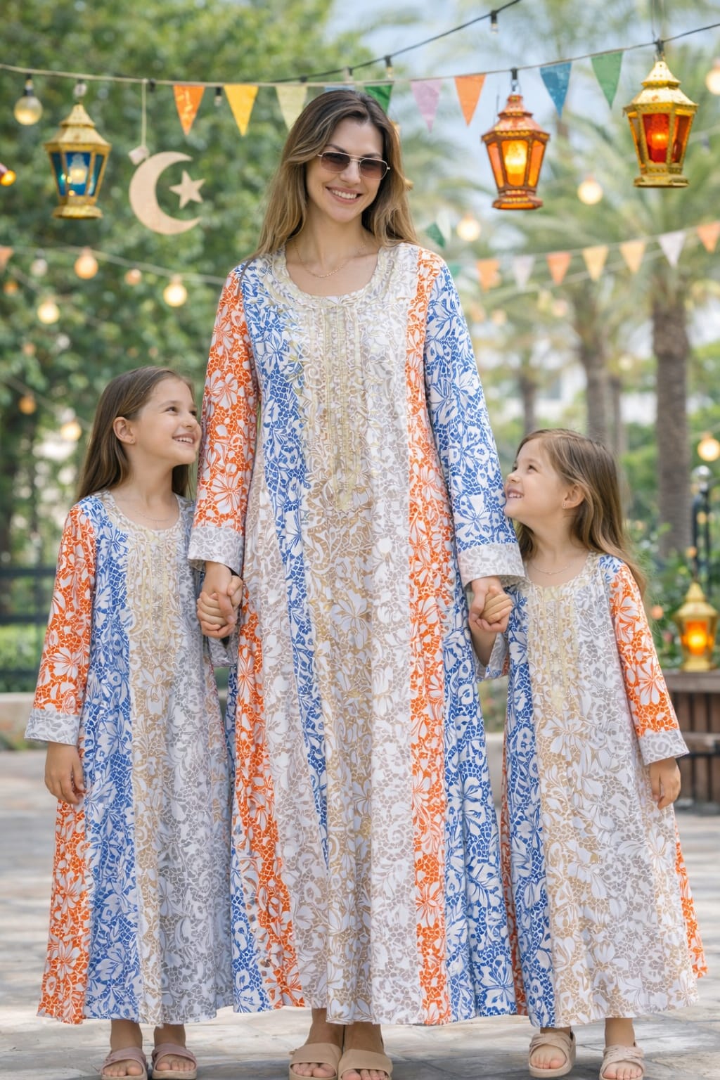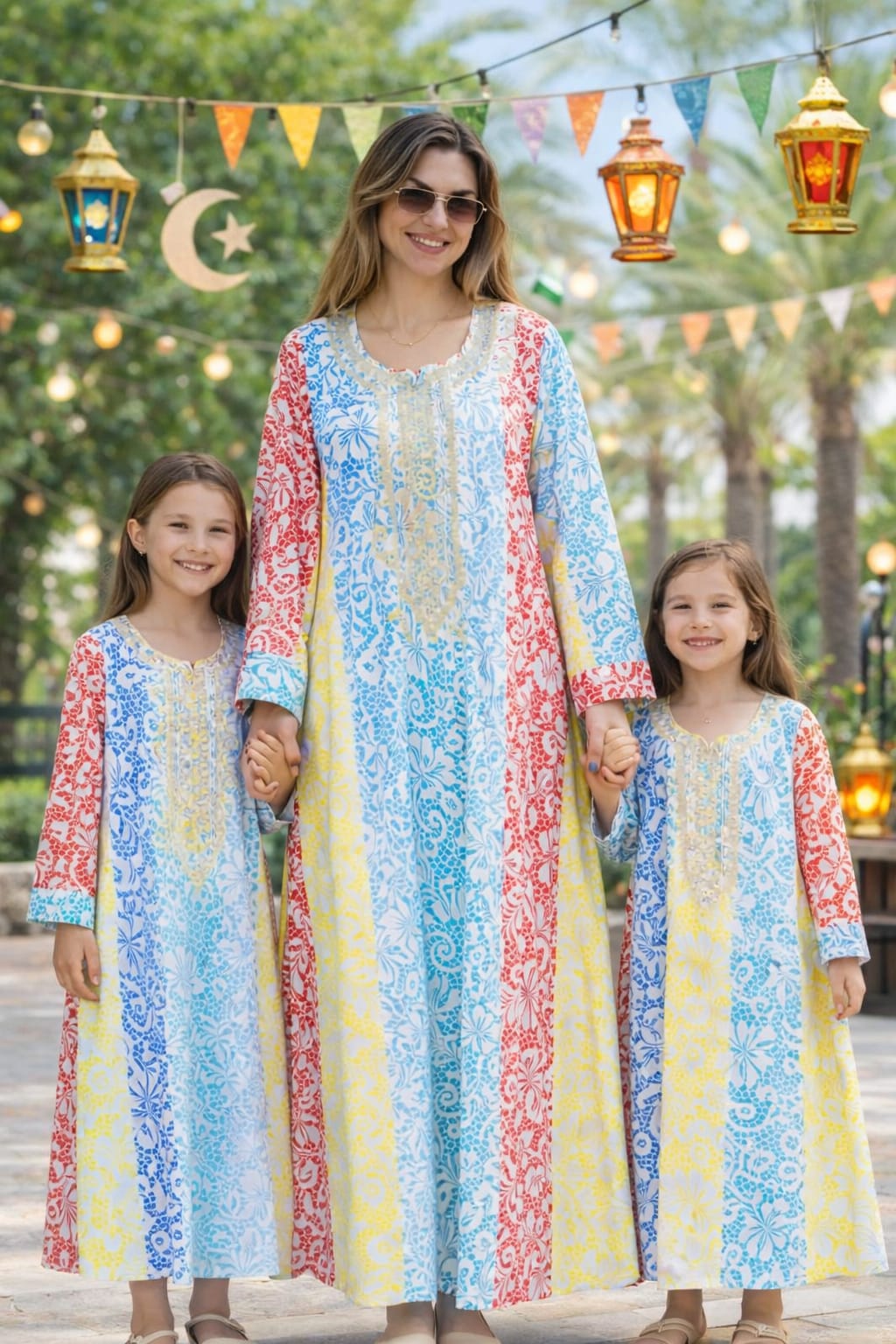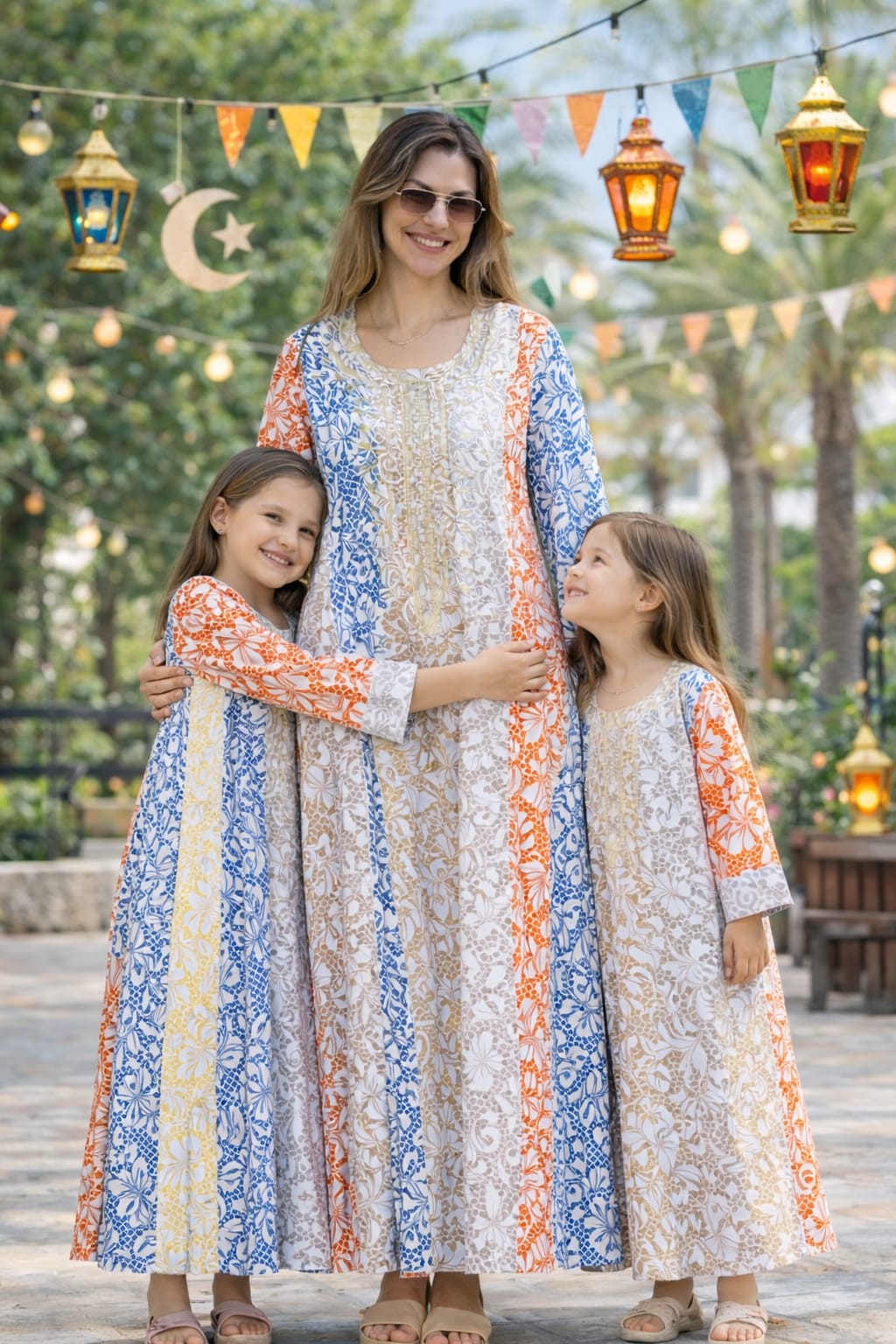 جلابية من القطن المصري المعالج ضد الانكماش وبتطريز من خيوط الصرمه الذهبية بالوان مبهجة ومتناسقة فيما بينها