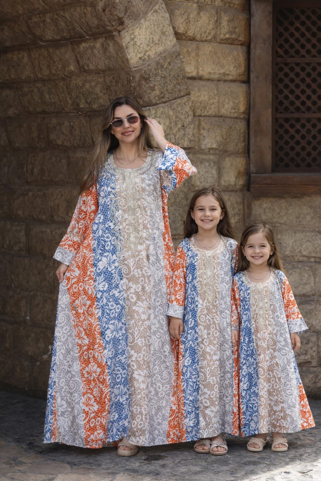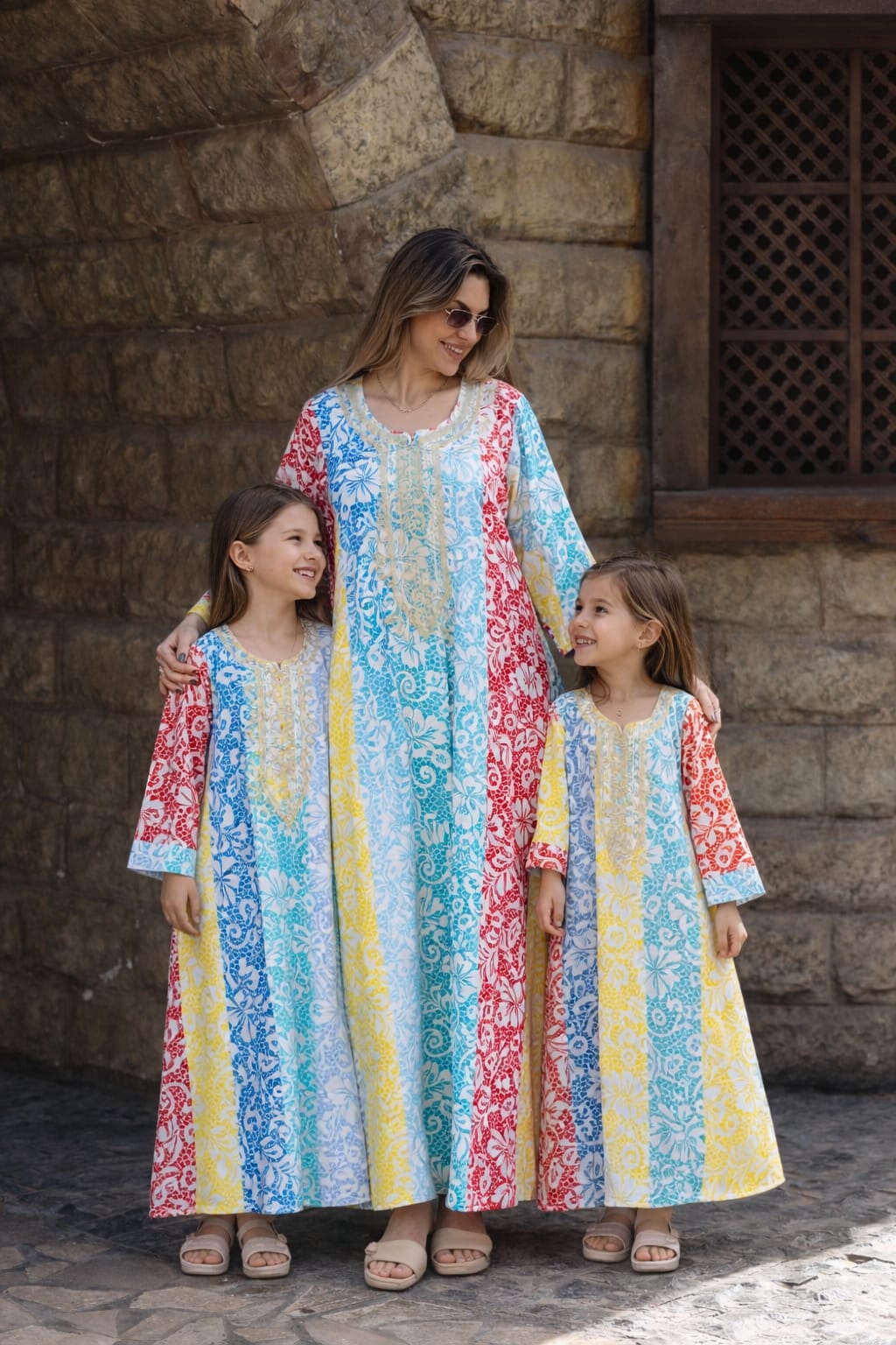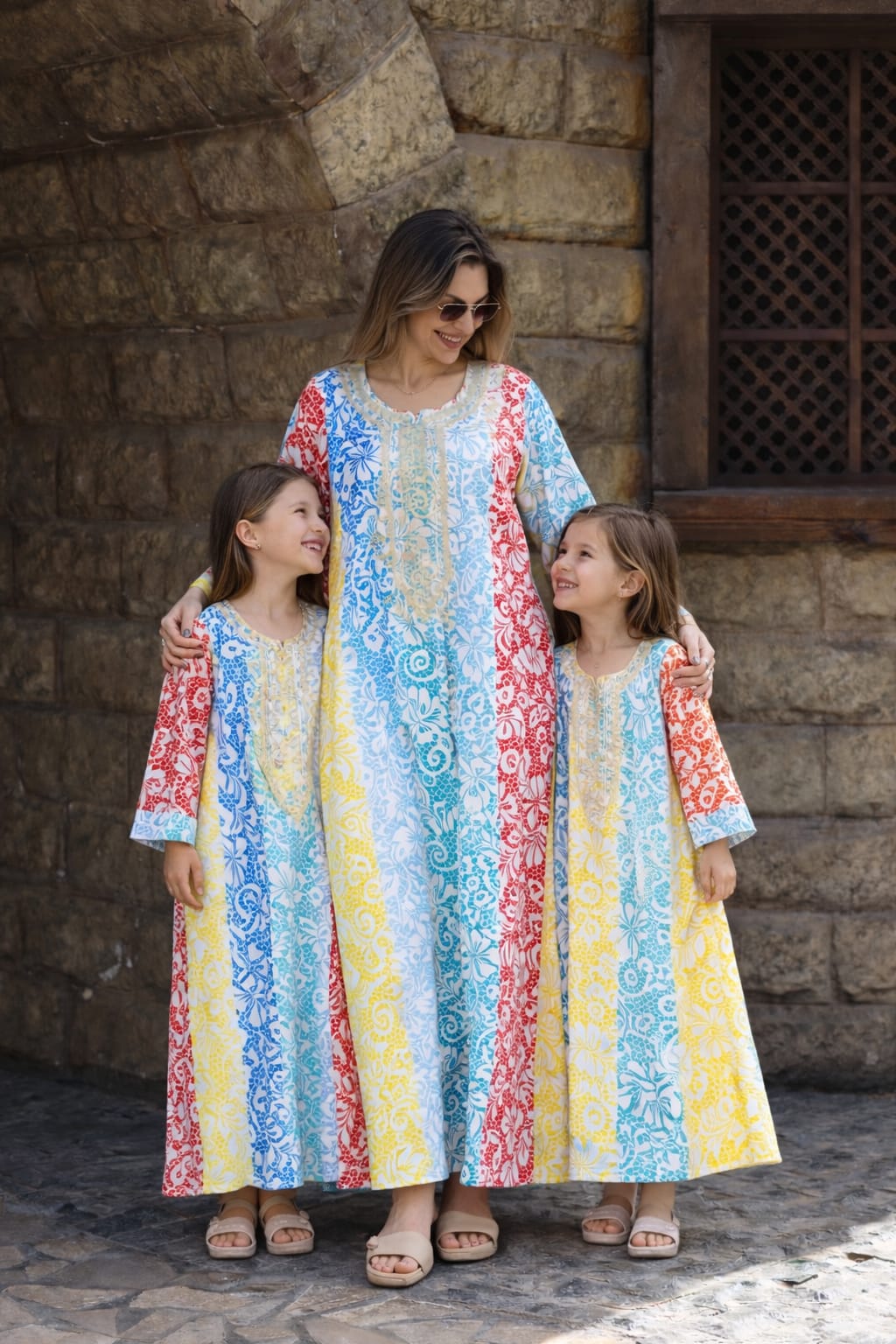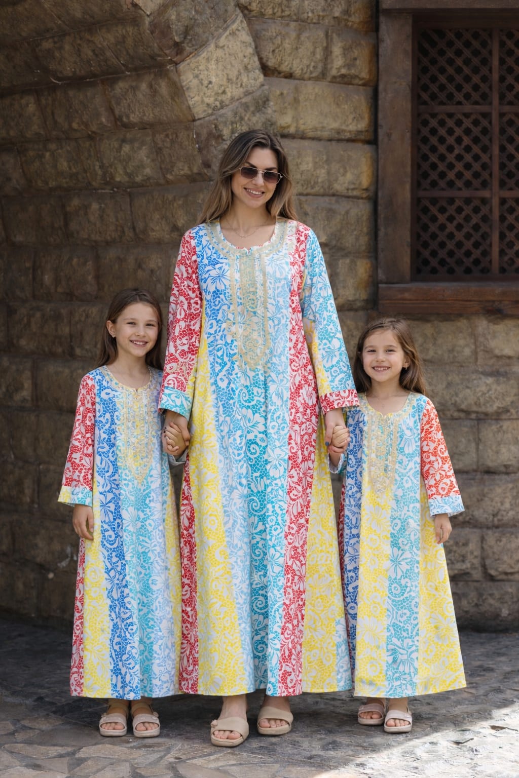 جلابية من القطن المصري المعالج ضد الانكماش وبتطريز من خيوط الصرمه الذهبية بالوان مبهجة ومتناسقة فيما بينها