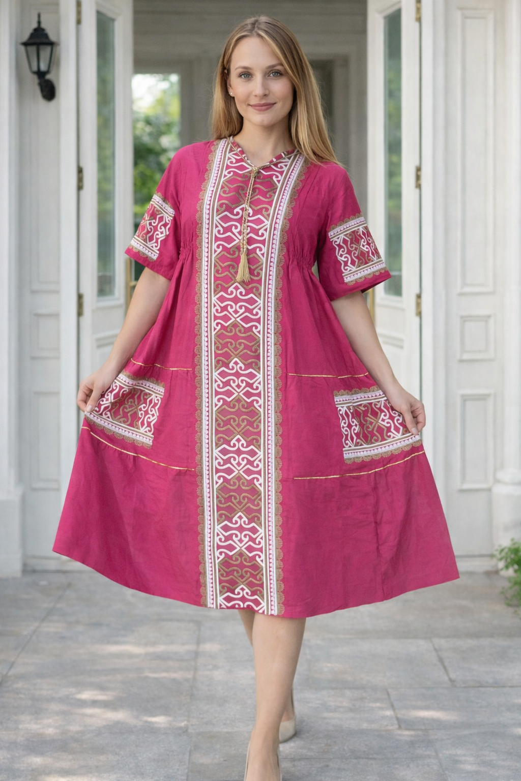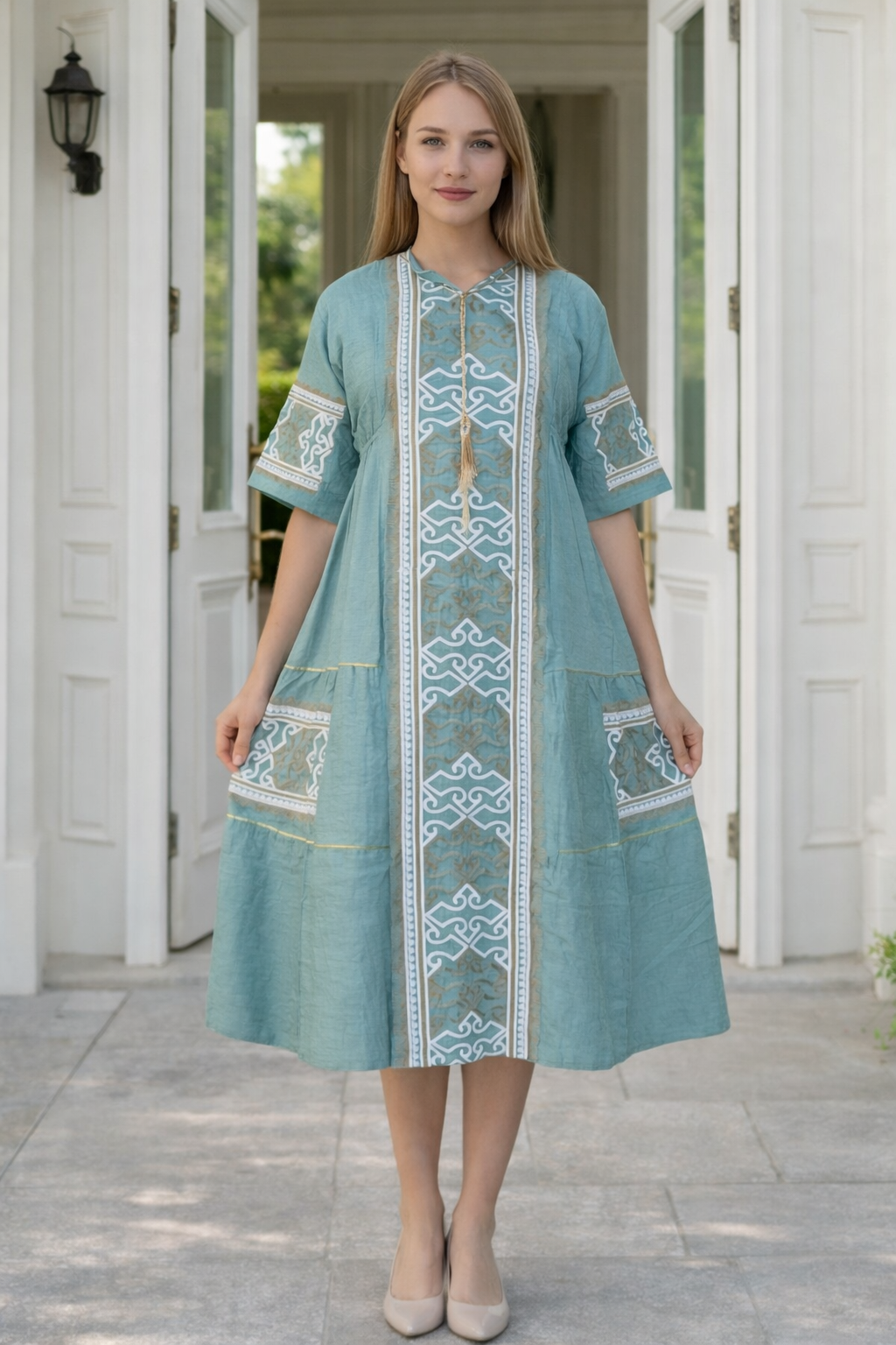 H7 جلابية كتان بتطريز من الطراز الاسلامي